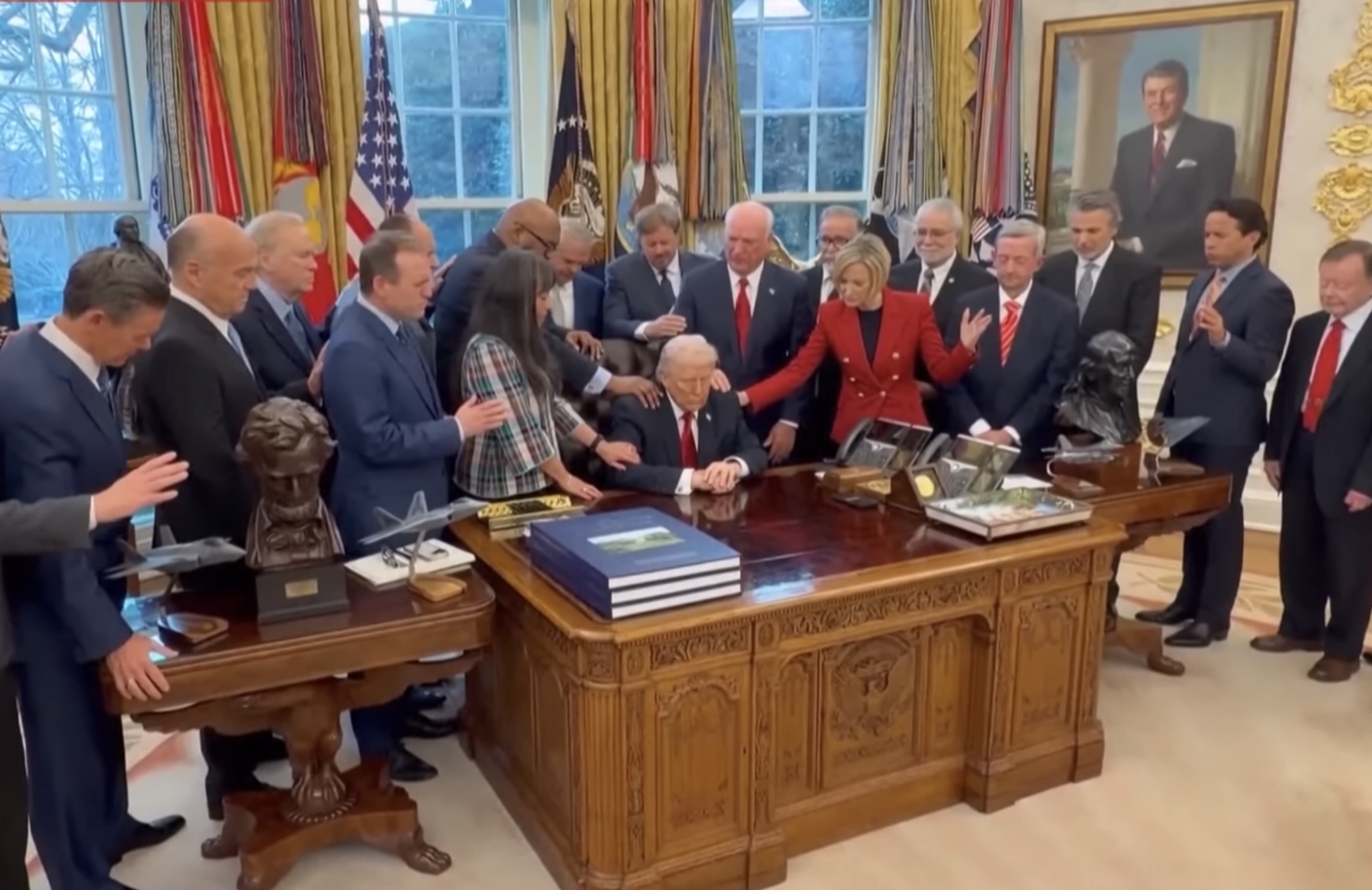 Beschreibung: Auf der bildlichen Darstellung wird der aktuelle US-Präsident Donald J. Trump von seinen Anhängern angebetet. Trump wird hier als Messias oder sogar als Gott verehrt. (DienDarstellung ist völlig surreal. Das ist absolute Gotteslästerung. Die Darstellung ist durch keine künstliche Intelligenz erzeugt, sondern Realität.)