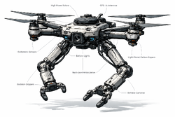 Die Drohne verfügt über zwei mechanische Greifarme mit jeweils mehreren Gelenken, die eine flexible Bewegung in drei Dimensionen ermöglichen. Die Greifflächen sind mit rutschfestem Material beschichtet, um sichere Handhabung unterschiedlichster Objekte zu gewährleisten. Die Greifarme sind mit Kraft- und Positionssensoren ausgestattet, um Schäden an den gegriffenen Objekten zu verhindern und präzise Manipulationen zu ermöglichen. Die maximale Tragfähigkeit pro Arm beträgt etwa 10 kg.